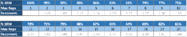 Using this table one can know how many maximal reps can be performed using certain load (% 1RM) and also, one can predict maximal load that can be lifted (1RM) using maximum performed reps and reconverting factor. For example, if one performs 10 reps with 225lb, his predicted maximum is 225 × 1.33 (reconverting factor), which is around 300lb. Please note that this table is different for different lifters and lifts, so take this as a rule of thumb and not locked into stone. But it can give you a pretty good indication of where you are when you are training.