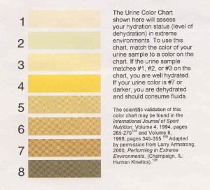 We tell our athletes, and the clients we train, that they need to “Pee Clear Once a Day!” Sorry about sounding so vulgar, but if you look at the Urine Chart (also attached) – urineyou can see that when you go to the bathroom, your urine should be clear. The darker it gets, the more you need to add WATER into the day.
